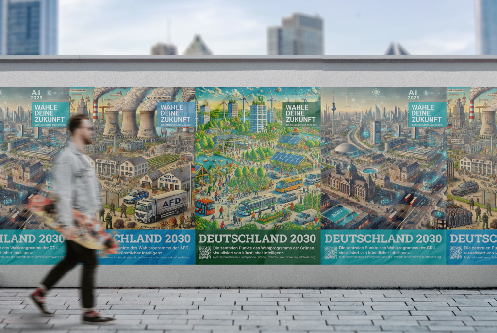 Mit Bildern können wir komplexe Themen schnell und einfach visualisieren. Bei unserem Ansatz helfen uns künstliche Intelligenzen dabei, die komplexen Wahlprogramme der Parteien neutral zu analysieren und auf Grundlage dessen „Prompts“ für die Erstellung von Wimmelbildern zu generiert. Die Leitfrage hier bei lautet: „Wie sieht Sachsen im Jahr 2030 aus, wenn das Wahlprogramm der einzelnen Parteien umgesetzt wird?“
