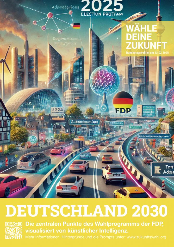 Erstelle ein sehr detailliertes und futuristisches Bild (Wimmelbild) der Welt im Jahr 2030 unter der Umsetzung des Wahlprogramms der FDP. Die Szene sollte dynamisch, fortschrittlich und voller Innovation sein. Die folgenden Elemente sollten besonders betont werden:
